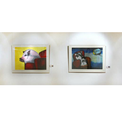 beyond that, however, to include more depth and insight. Feeling that "life is too serious" he now adds a whimsical element on each canvas by including something of the unexpected.