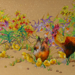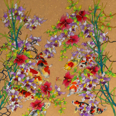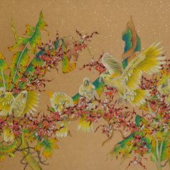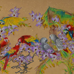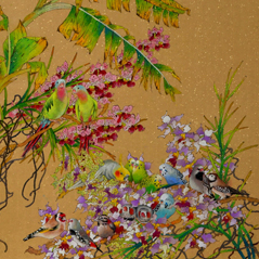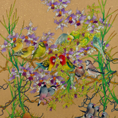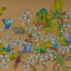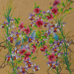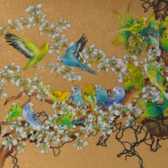 The two species of intertwined flowers coupled with a row of perched budgerigars compliments the scene and adds liveliness to the harmony of the composition.